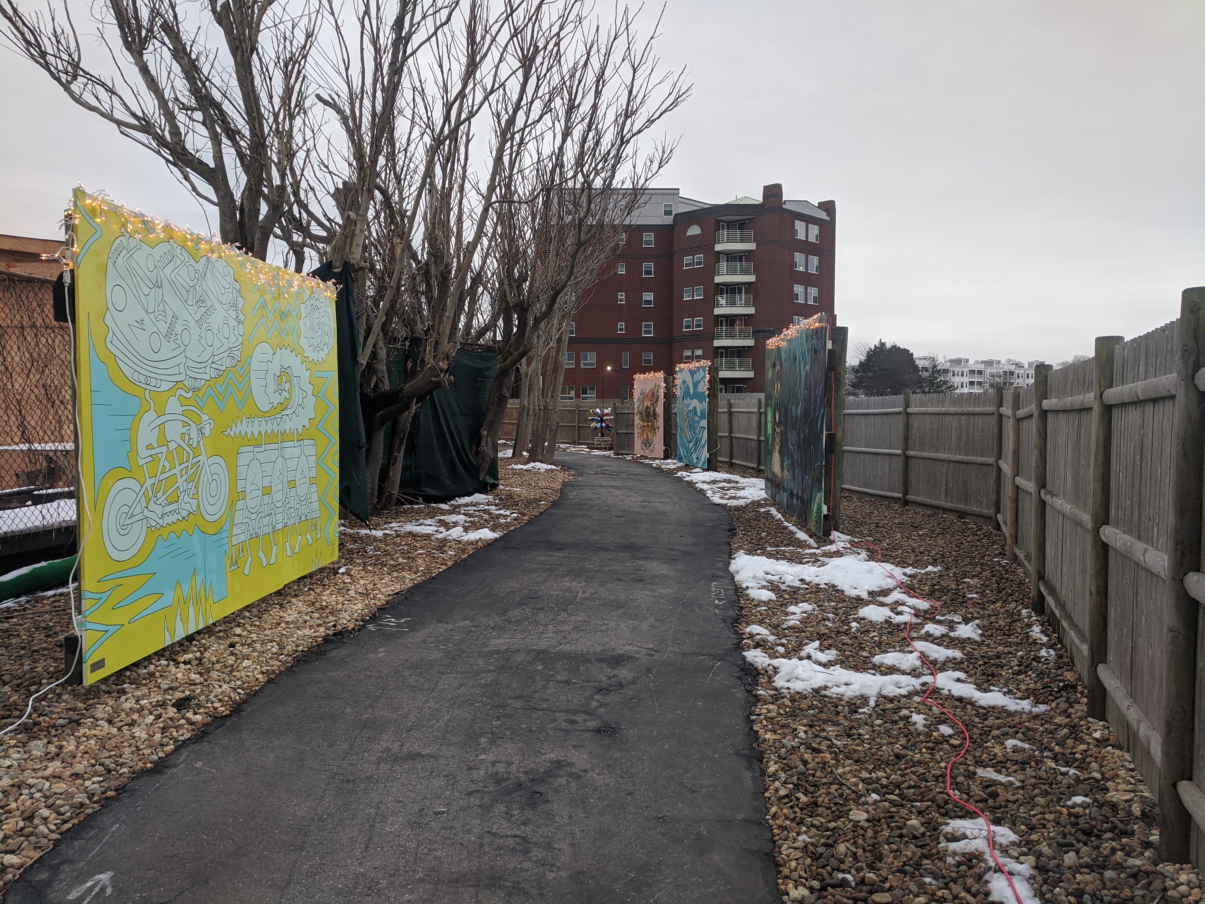 The Hull Artwalk transformed an abandoned pedestrian walkway and parking lot into a mutli-faceted public art installation off Nantasket Avenue, connecting the beach and the bay. The opening was Sept 4, 2019, and a ceremony hosted by the Hull Economic Development Committee and the board of selectmen. This day is now listed in the public record as “Hull Artwalk Day”!
