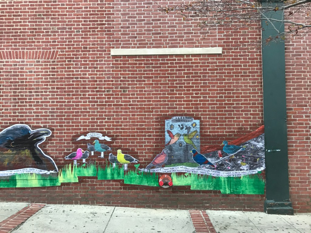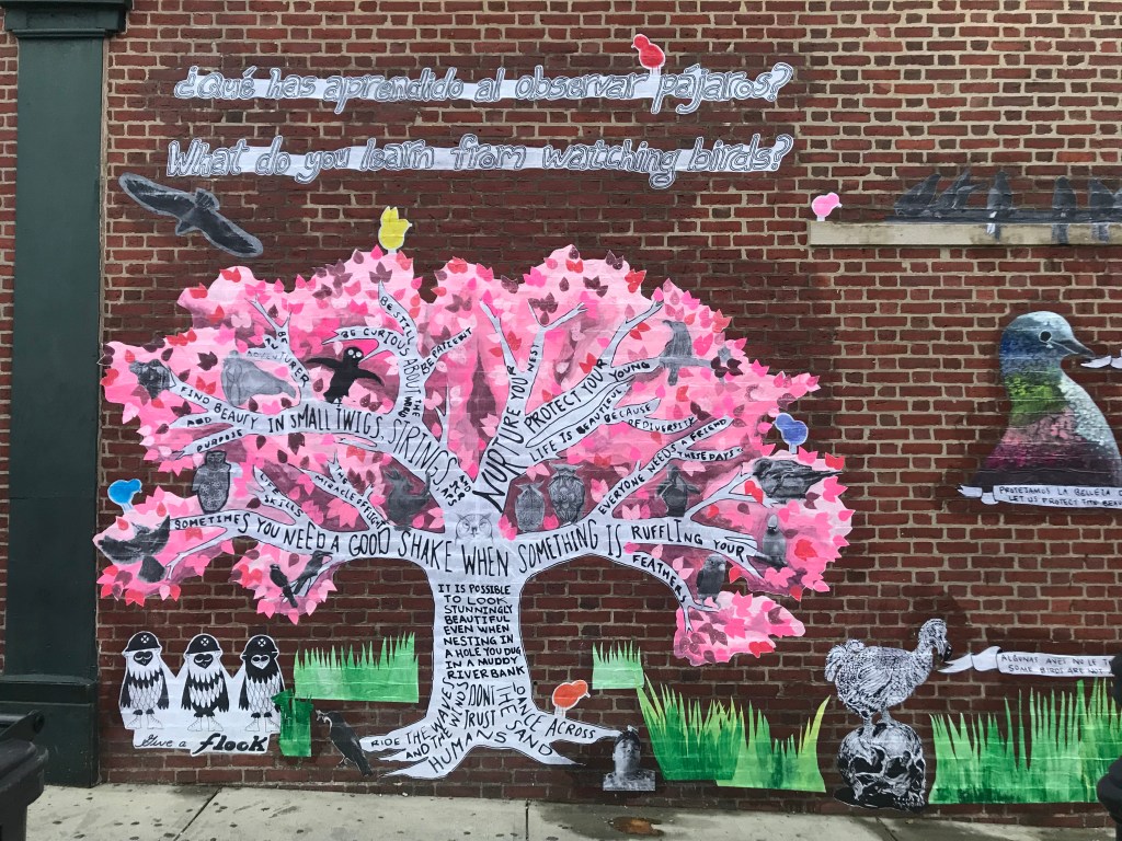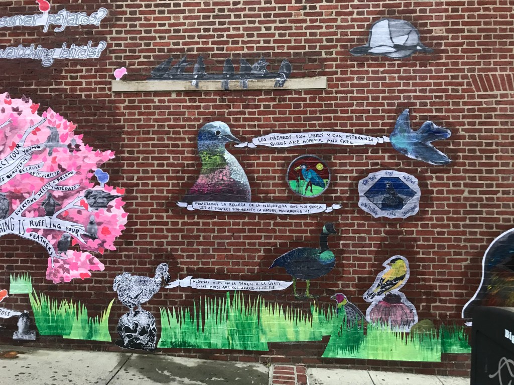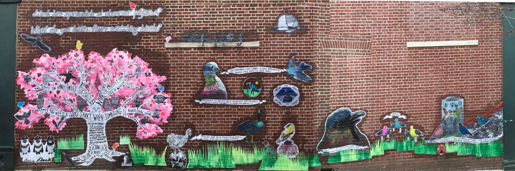 Members of the community sent in photographs, drawings, paintings, pictures of bird sculptures and responses to the question “What do you learn from watching birds?” I took their quotes and imagery and integrated them into a tree inspired by the Maquilishuat, the national tree of El Salvador. This tree was chosen because the City of Chelsea has a large population of residents from El Salvador. The wall became a collage of the imagery and written observations that people shared, and I added grass to make it more cohesive