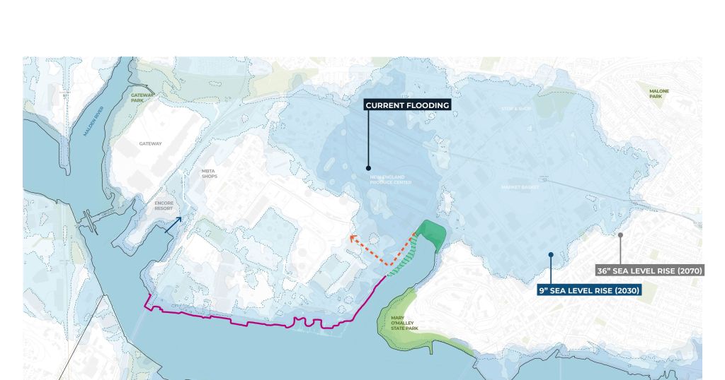 The Island End River was identified as a priority area in the City of Chelsea’s 2018 Municipal Vulnerability Plan. As the City of Chelsea works to address coastal flooding through a redesign and improvement of the Island End River Park, the City is also focused on improving park accessibility and placemaking, enhancing the natural shoreline, and providing equitable waterfront access to its diverse communities, which have been among the hardest hit in the state by the Covid-19 pandemic. Fruitful Resilience is intended to lift up resilience efforts that have been spearheaded by the Cities of Chelsea and Everett, as well as nonprofit organizations Mystic River Watershed Association and GreenRoots.