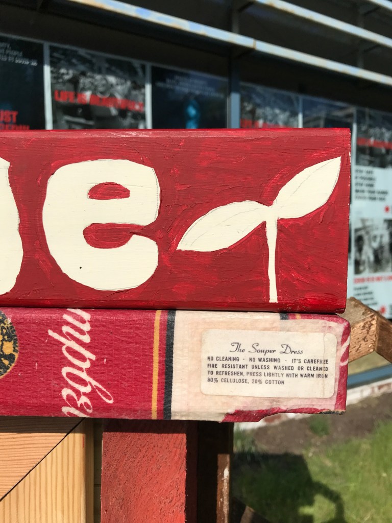 I chose to work with materials from the Campbells Souper Dress to alchemize the essence of consumerism that this disposable dress was created to promote and turn it into a garment to encourage regenerative community gardening practices.