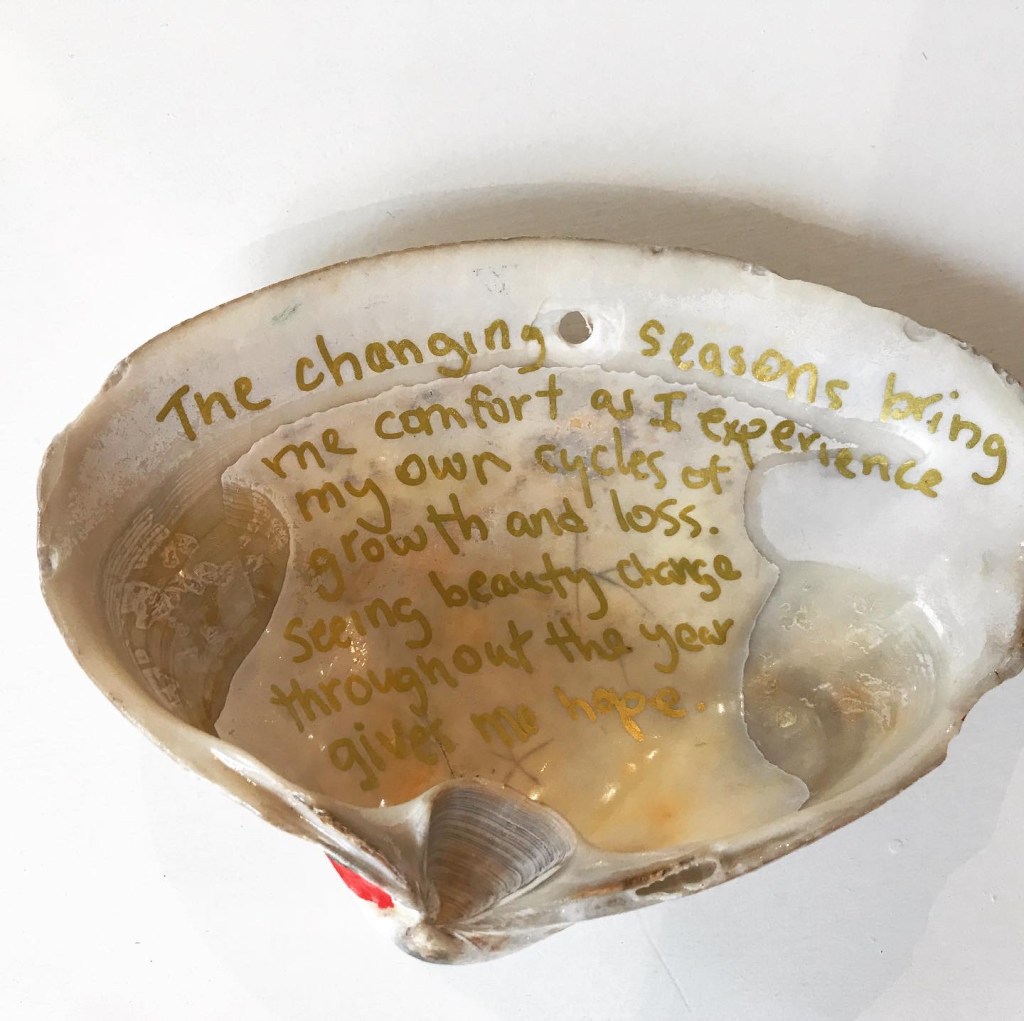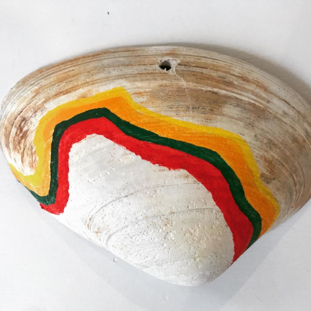 This project offers an opportunity to take some time to collaborate with a clam! The clam has returned to the earth but their shell remains. Each shell was taken from the habitat from which the clam grew. What can we give back in return? Making a commitment to collaborate with the clam is a giving gesture that offers hope for new behaviors as people more and more start to see themselves in relationship with all other living beings as opposed to consumers of them.