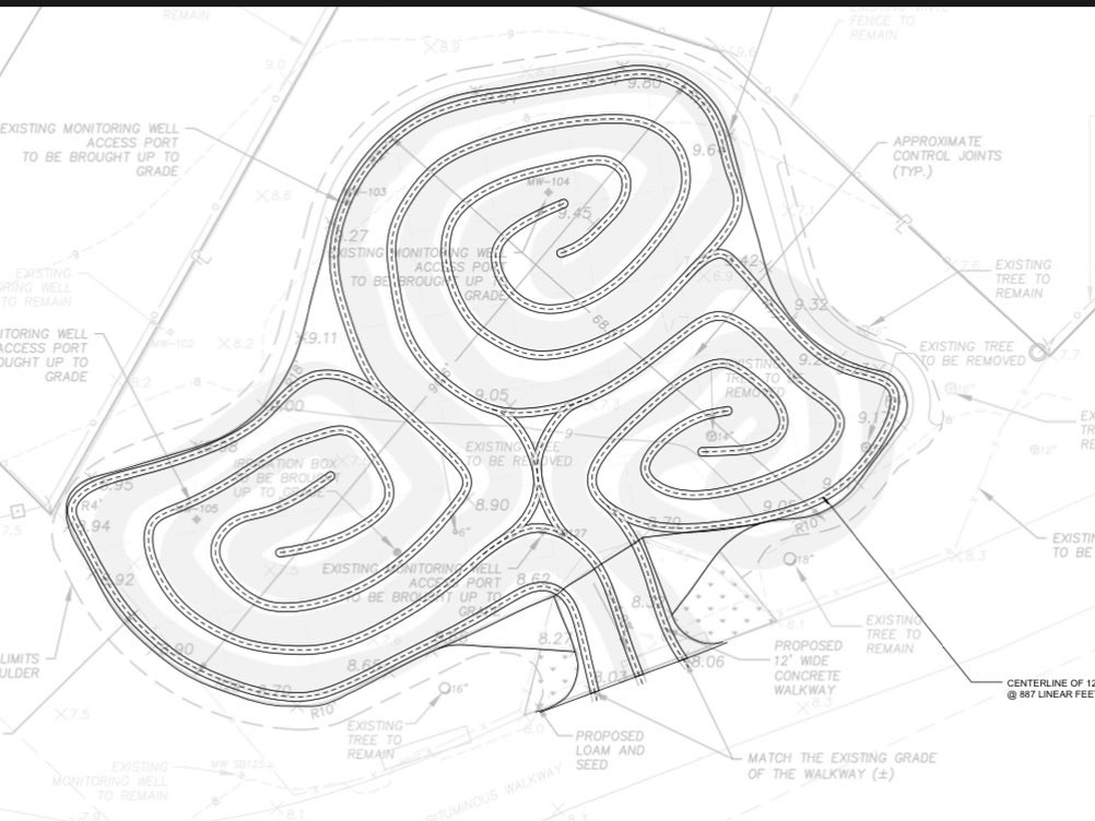 I worked with the City of Medford to design and construct a meditation labyrinth on a site in Medford that showed exceptionally high levels of soil contamination and needed to be covered with a concrete cap (a type of engineered barrier) so that it would not will not pose a risk to park users or to the general public. This journey of transforming a contaminated site to a space of healing involved abutting neighbors, city staff, T.Ford Construction company, and the collaboration of Terry Carter, who penned 3 verses in the middle of each labyrinth swirl, and was a wonderful thought partner in deciding the words on the welcome/exit arch. This project was funded by the City’s Community Preservation Act Fund.