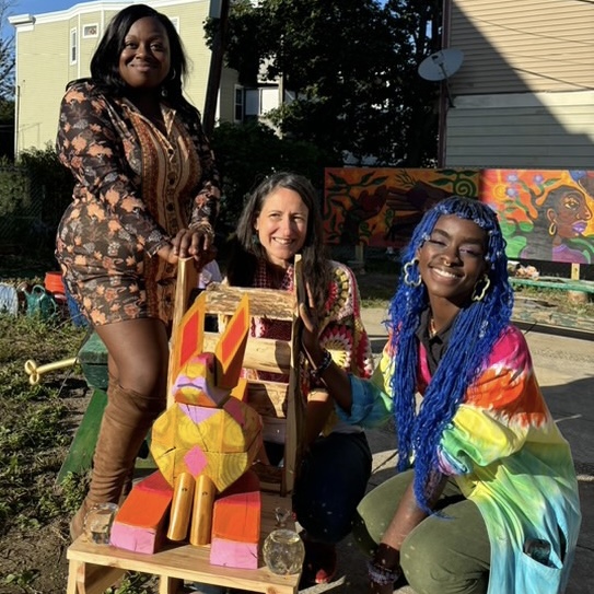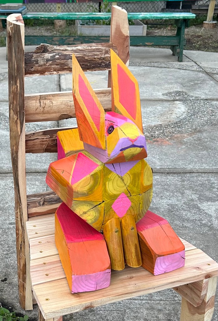 Fall 2024 I worked with muralist Mithsuca Berry to envision and create art that would create a more inviting environment at the Woolson Street Community Garden in Mattapan. This initiative was expertly led by Robyn Gibson, who also curated the ten year anniversary of the garden, which was a true celebration of community and life, and featured music, dance, poetry and spoken word, food, an herbal apothecary, and massage! No stone was unturned and it was an honor to be part of it. I’ve been wanting to work more with color for a long time and have had a hard time getting into it, but in this project Mithsuca was an amazing guide for me in working with color. It was a first for me to create such colorful pieces and it was really hard but I truly love these bunnies. They are made with repurposed 4”x4” lumber that was onsite.