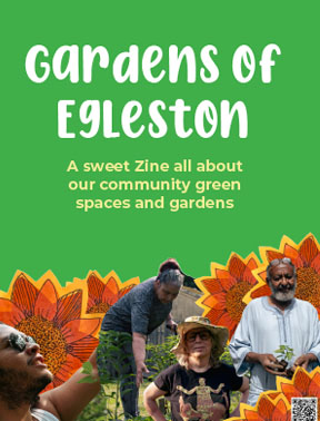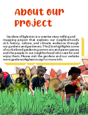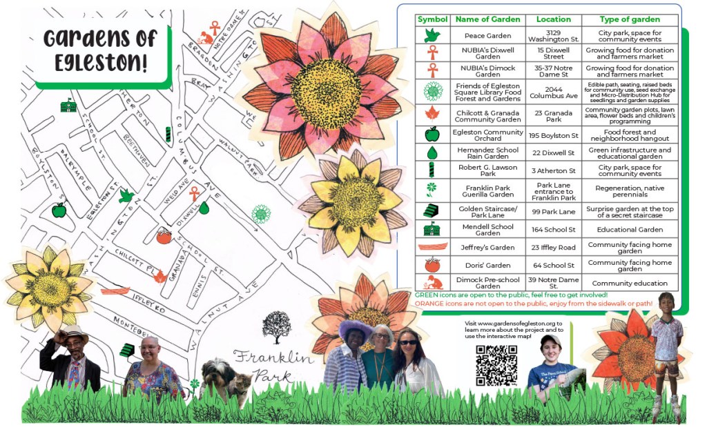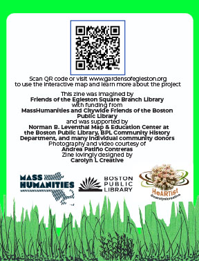 Gardens of Egleston is a community storytelling project about gardening, food, culture, and resilience in Boston’s Egleston Square neighborhood. The team mapped our gardening commons to remember the wisdom of Egleston’s gardeners as our neighborhood navigates social, environmental, and economic challenges. I was invited to create a zine about the project so that people could have a physical map to visit these spaces and do their own walking tour. I wanted to evoke the warmth and character of our community so used hand drawn imagery and lots of images of community members. Making this felt like an expression of love for my community. Visit https://gardensofegleston.org/ to check out the digital interactive map and for more info about the project.
